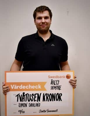 En person som får priset för att alltid sprida glädje på planen. Som alltid är seriös och i tid, väl förberedd för match. Tar varje chans att vidareutbilda sig. Med sin kollega eller via egen utbildning. Ett föredöme för alla. Årets Domare heter Simon Dahling.